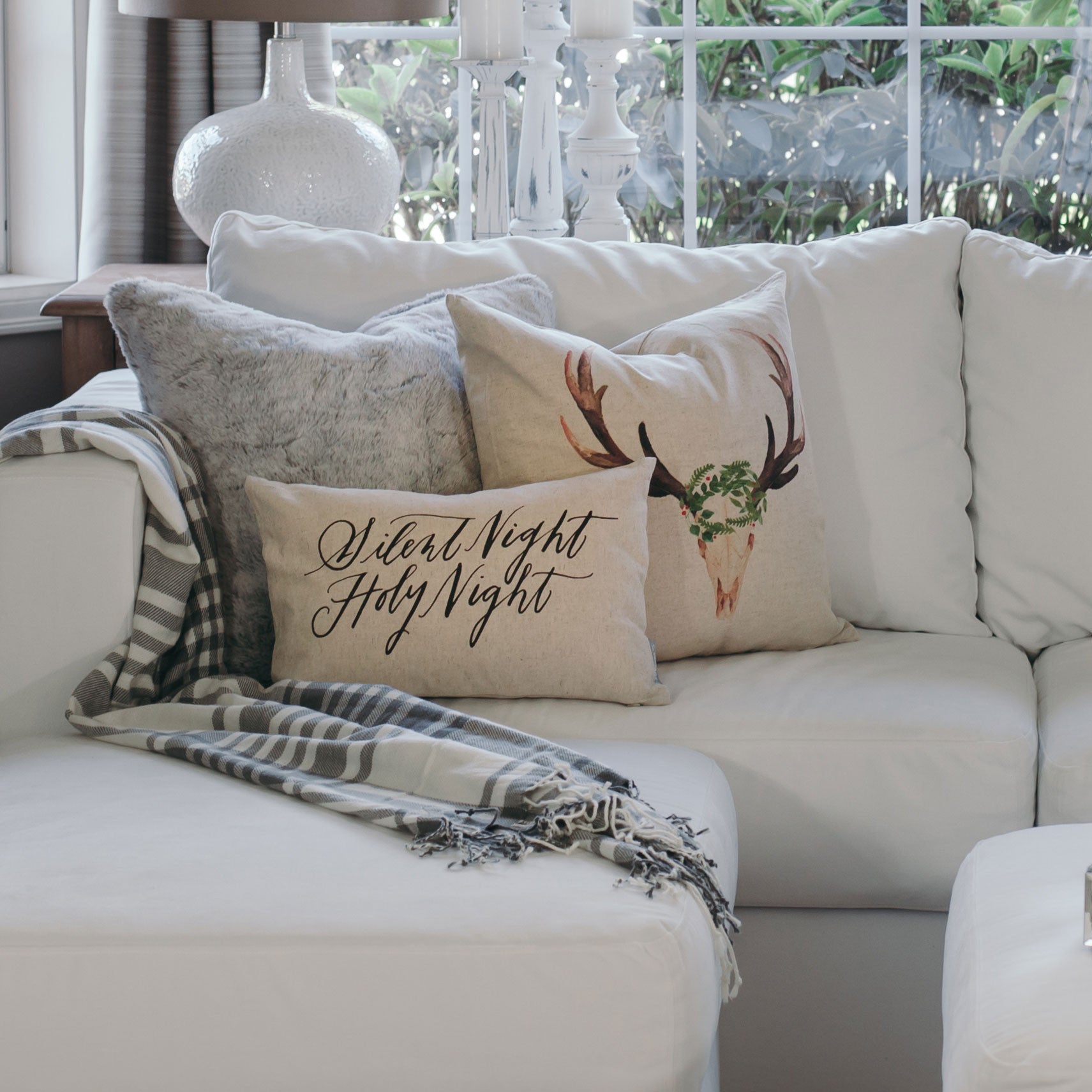 • A graceful evergreen wreath accents the antlers of a holiday-themed pillow cover.