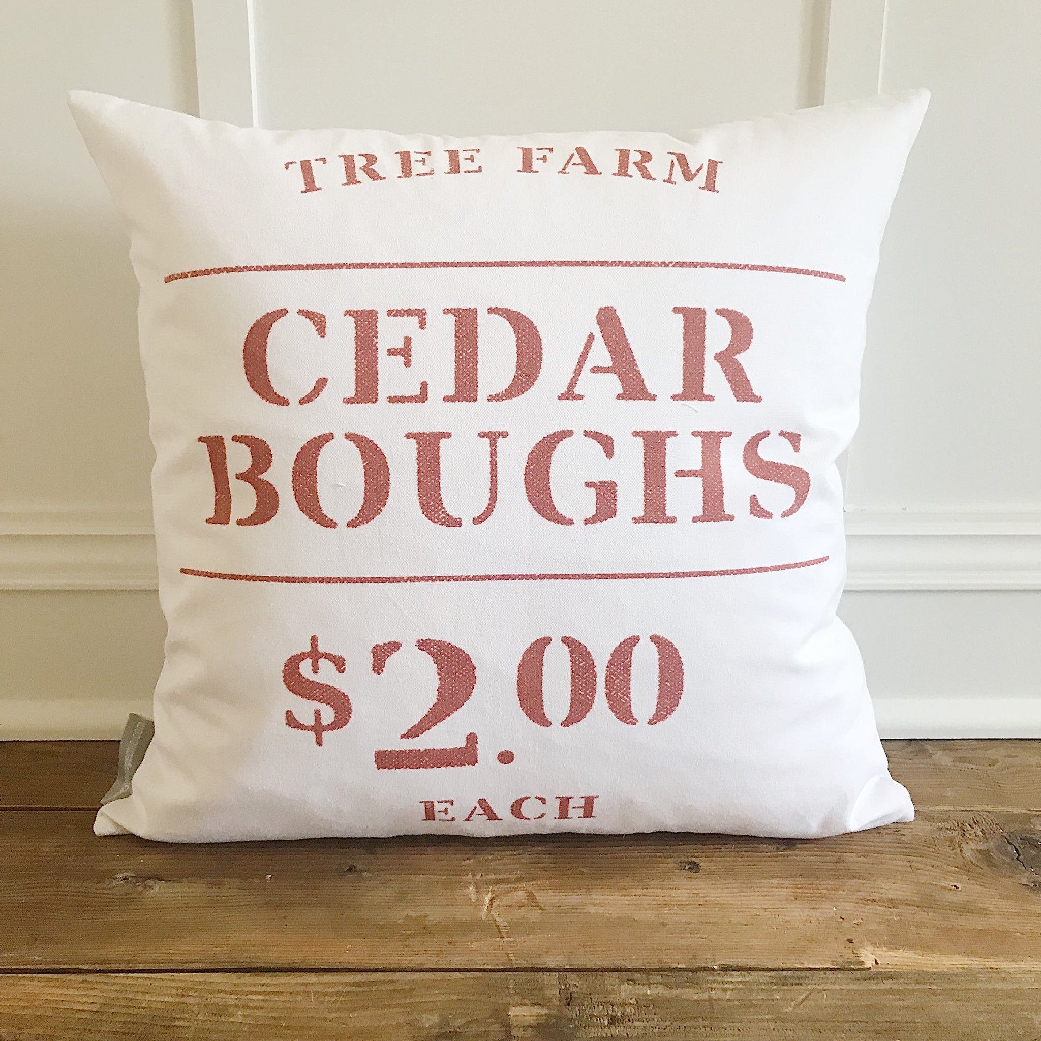 • A farmhouse-inspired stenciled sign, printed in a muted red, advertises a good deal on cedar boughs covering the front of a winter-themed pillow cover.