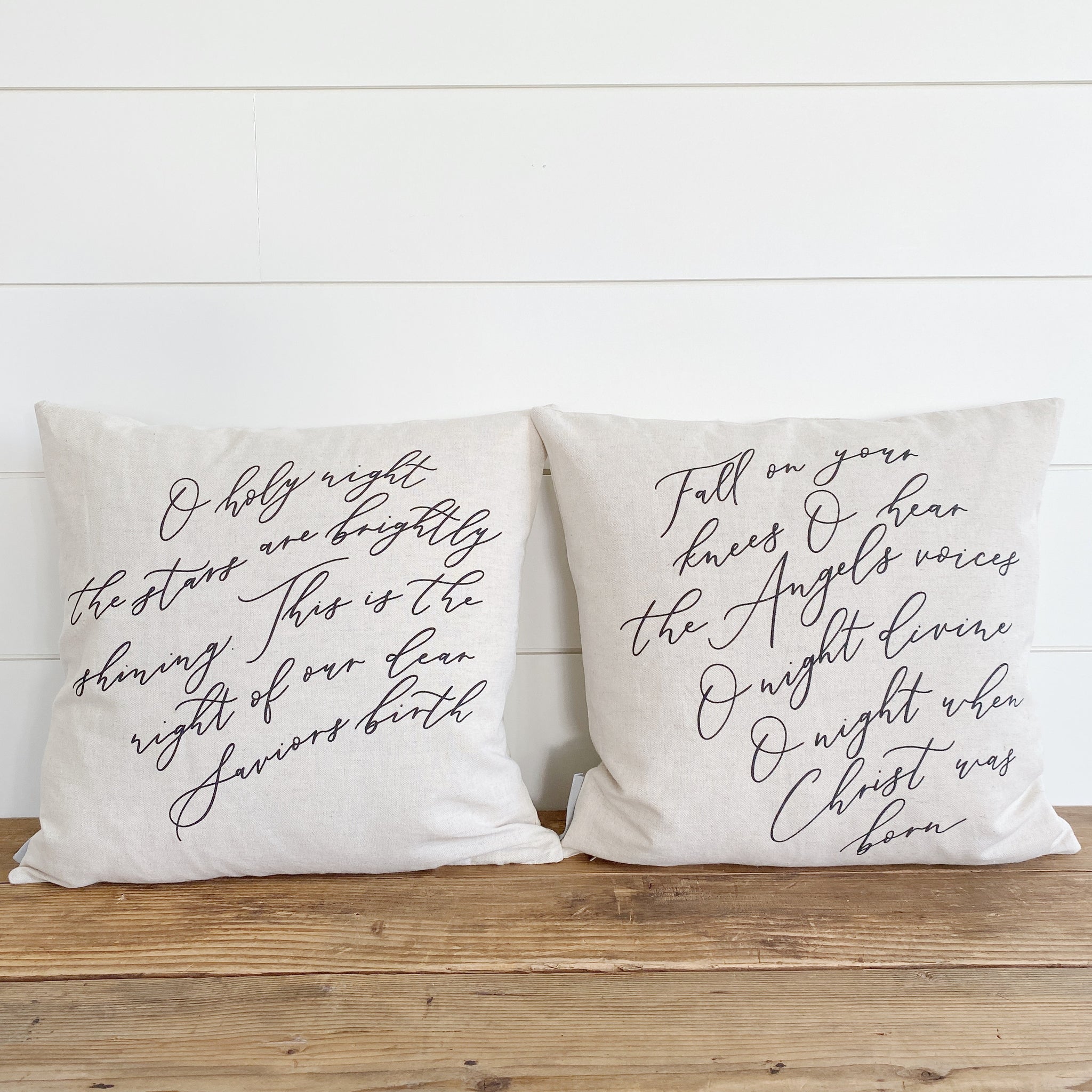 Gorgeous calligraphy script sings out worship and Christmas beauty on the front of a go-with-anything pillow cover.