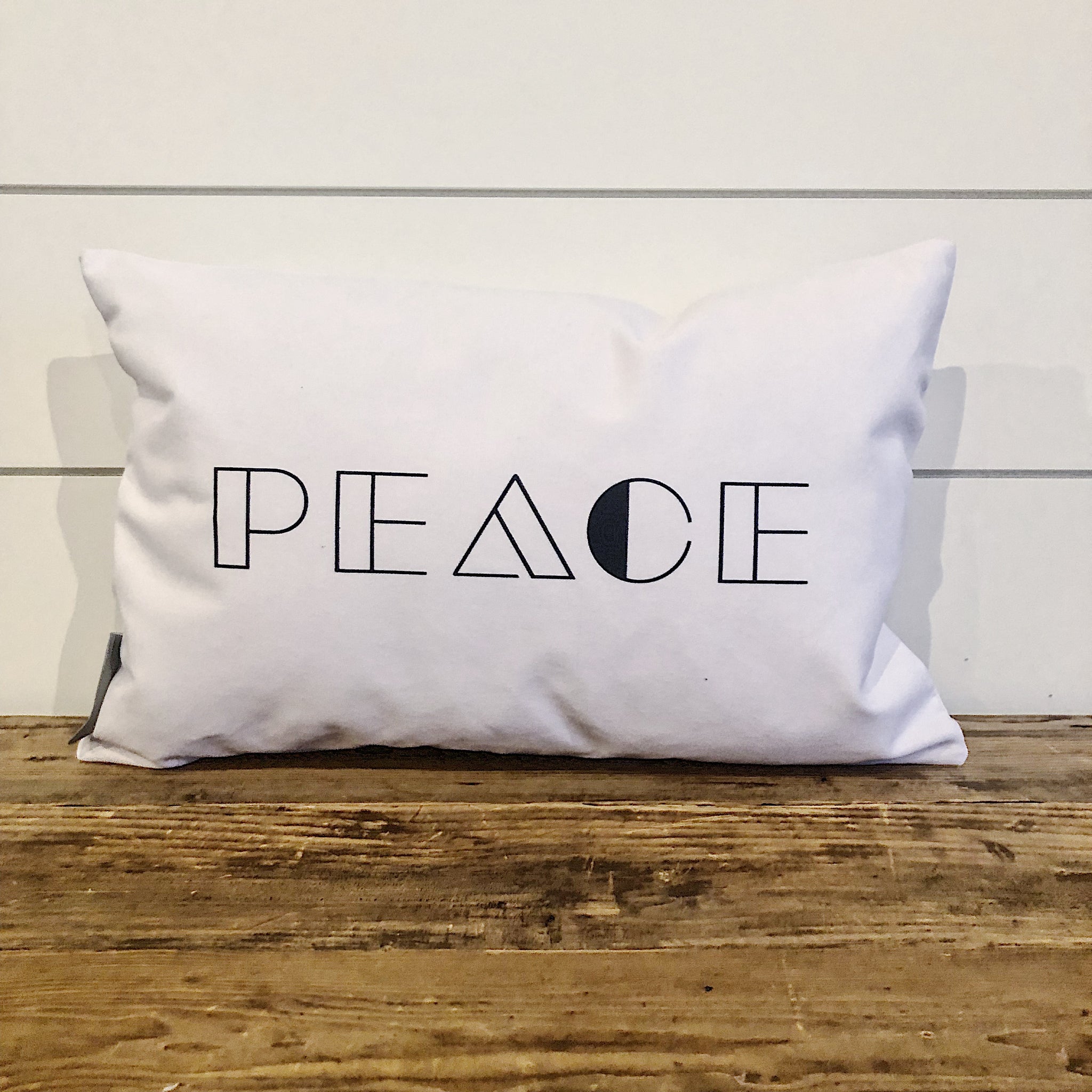 "Peace" in unique and modern lettering adds a hopeful message on the front of a Christmas-themed (or anytime!) pillow cover.
