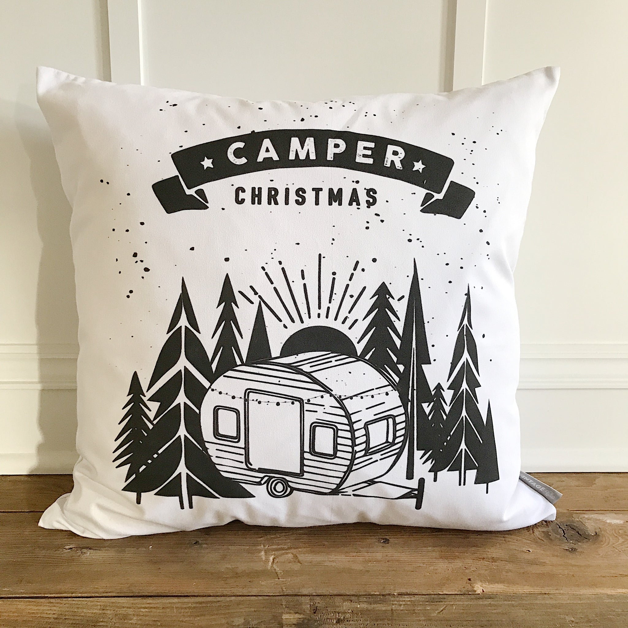 Tucked in the snowy woods for a cozy Christmas, this merry pillow cover gives a nod to new Christmas traditions.