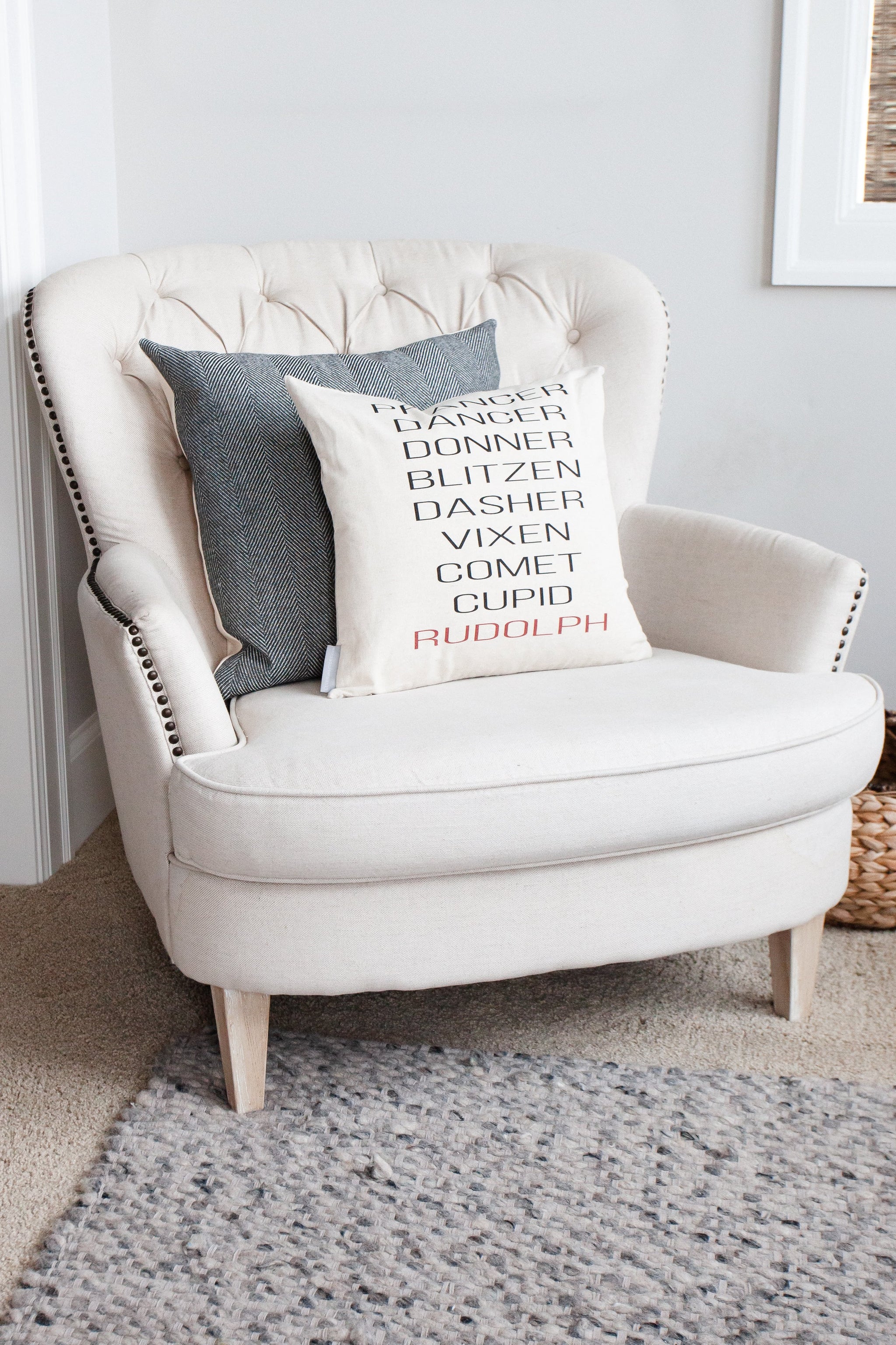 • Here's the line up! All Santa's reindeer are ready to go, but of course Rudolph guides in red. All the names are printed clearly on a magical Christmas pillow cover.