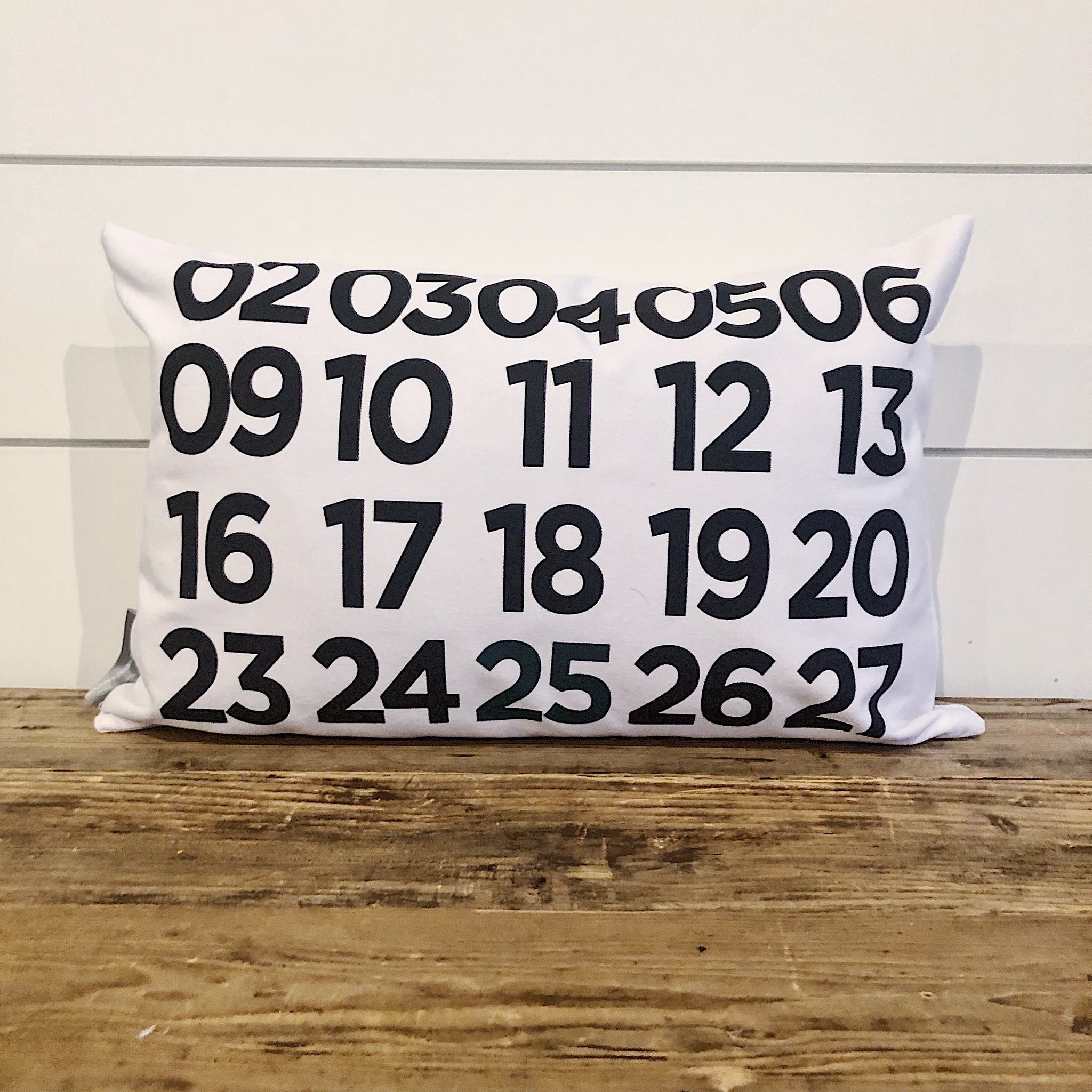 The modern vibe of a Stendig calendar, in it's signature black and white, covers the front of a Christmas-themed pillow cover.